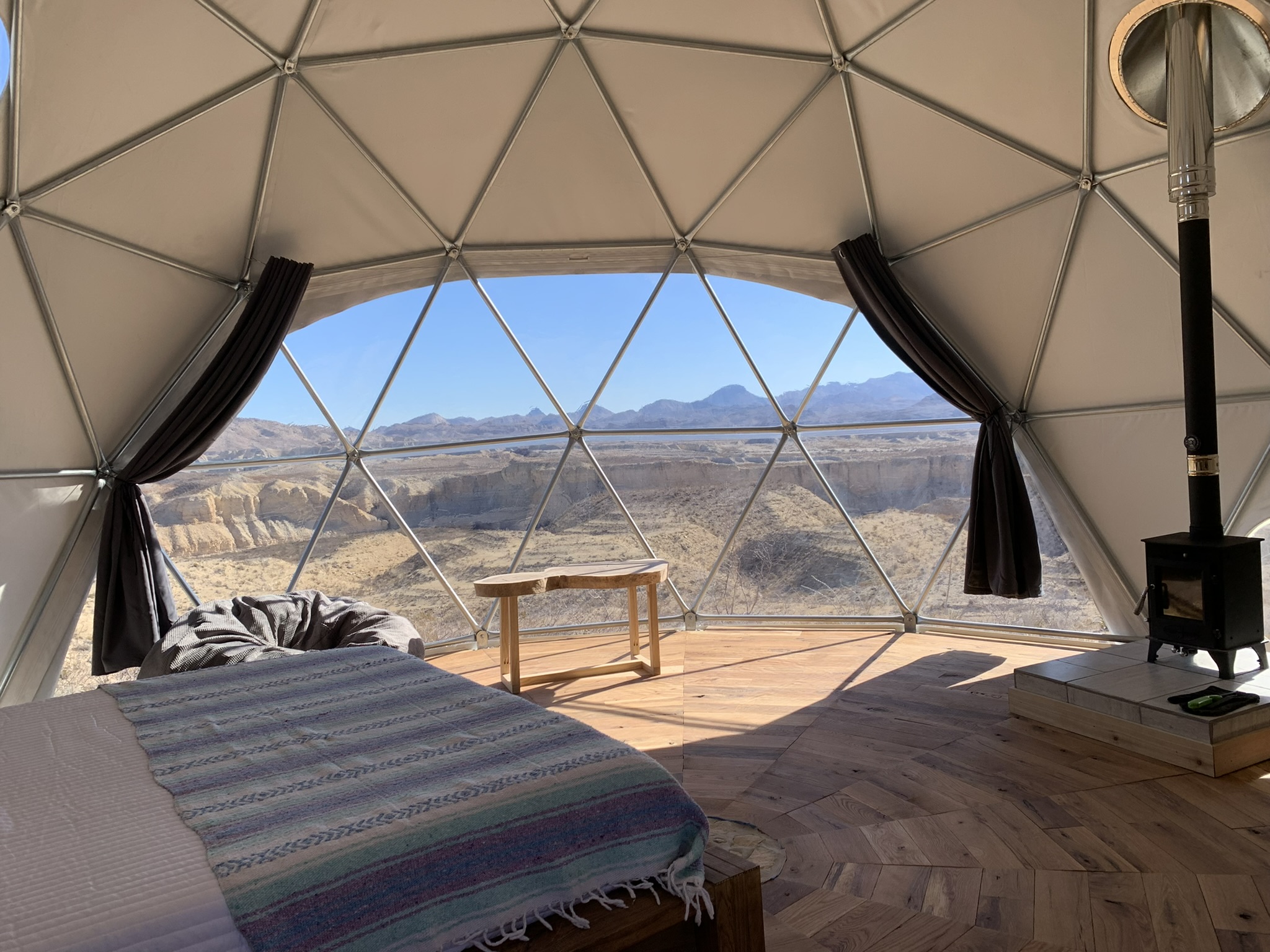 Our dome is installed in Terlingua, TX located in the Big Bend region of the Chihuahua desert. Elevation is about 3,500 ft above sea level. In the winter it gets down in the 30’s at night and typically mild during the day. Summer is scorching hot between 11 am to about 6pm and in the low 70s at night.