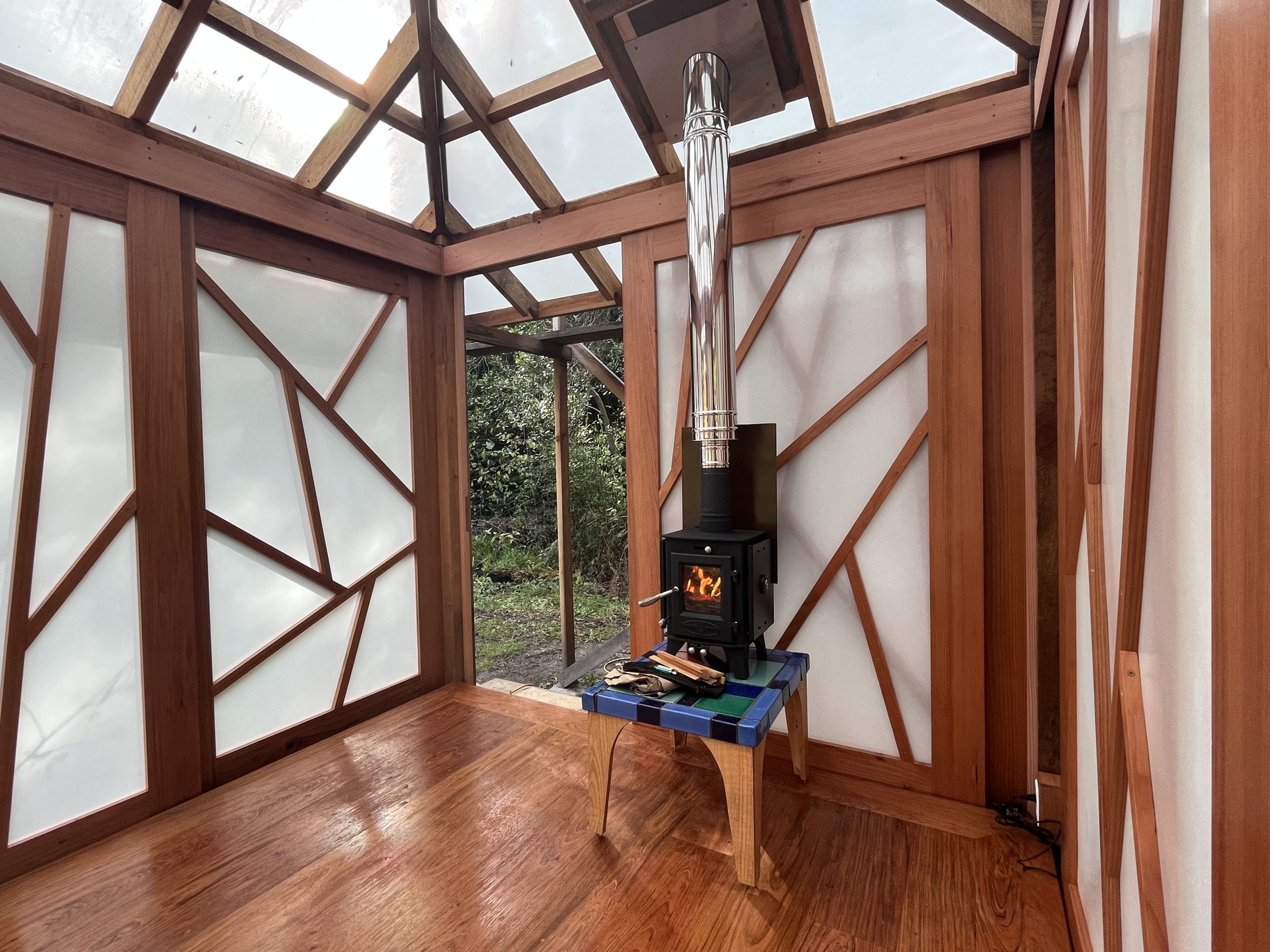 Our little Teahouse structure is unique and more of a sculpture than a practical building! As mentioned we added underfloor electric heating to comfortably use the space year-round. A well-insulated space of this size in our climate would be very well heated by this tiny stove.